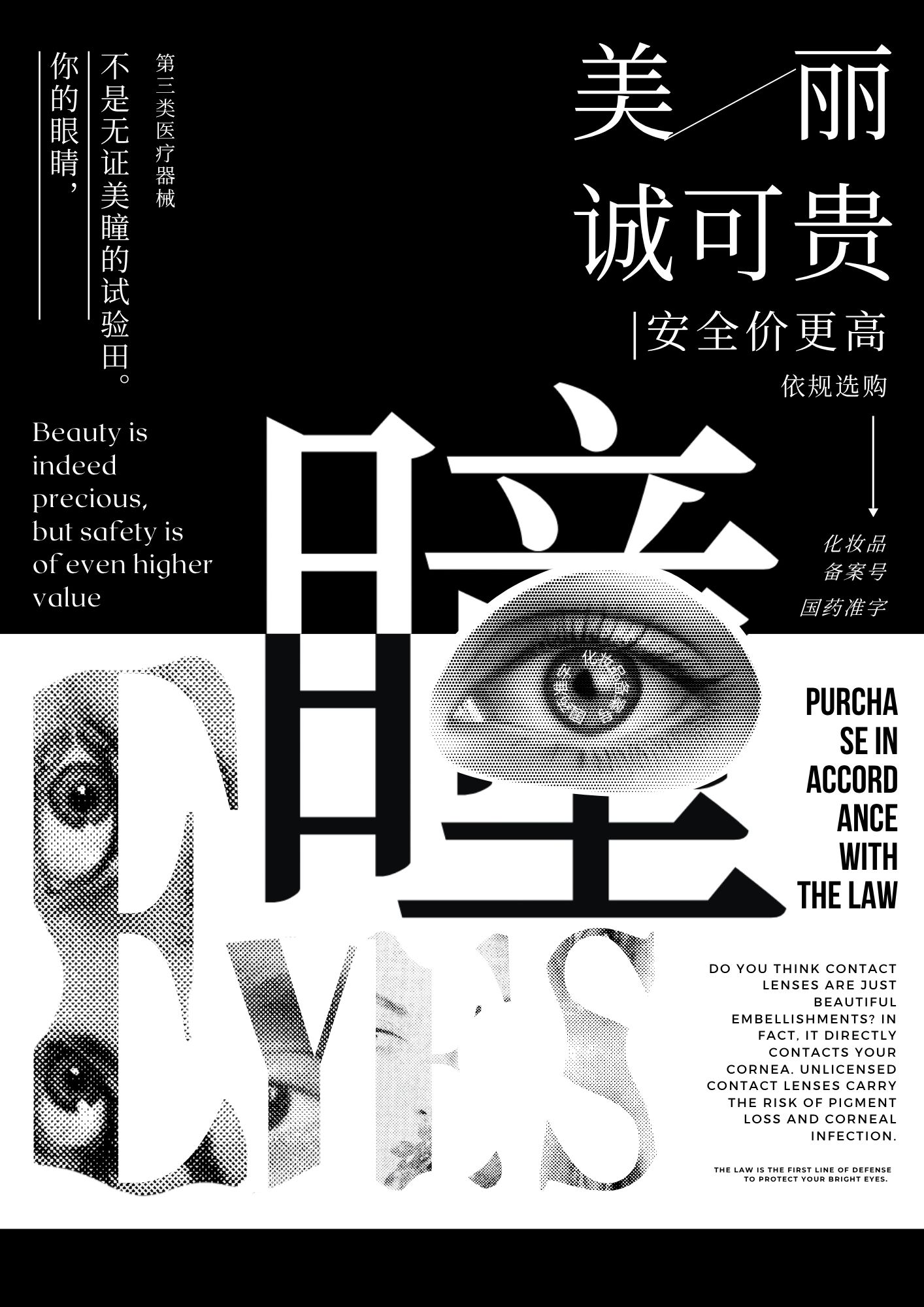 本海报聚焦“美瞳”这一第三类医疗器械,以黑白视觉风格强化普法的严肃性。核心创意是将“瞳”字艺术化设计,结合多组眼部视觉元素,直观传递美瞳与眼部健康的紧密关联。通过“你的眼睛,不是无证美瞳的试验田”等文案,搭配合规提示,警示无证美瞳可能导致的角膜损伤等风险,呼吁消费者依规选购。整体设计以强烈的视觉冲击和清晰的信息层级,普及“两品一械”法规知识,助力提升公众对美瞳类医疗器械的法律认知与安全意识。