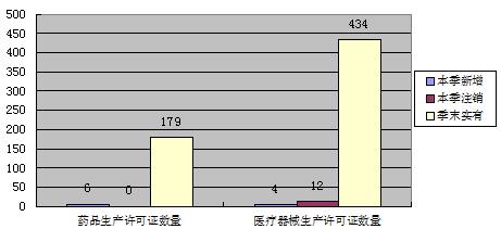 本季新发药品生产许可证增加6本,注销0家,期末合计179本;新增医疗器械生产许可证4本,注销12本,期末合计434本;药品批发企业增加3家,注销0家,期末合计261家;零售连锁企业增加0家,注销1家,期末合计104家;本季共受理药品注册236件,其中补充申请143件,再注册93件。