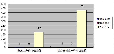 本月药品生产许可证增加1本,减少0本,期末合计177本,医疗器械生产许可证增加3本,减少3本,期末合计430本;药品批发企业增加1家,减少0家,期末合计262家;零售连锁增加0本,减少2本,期末合计103家;本月共受理药品注册65件,其中补充申请44件,再注册21件。